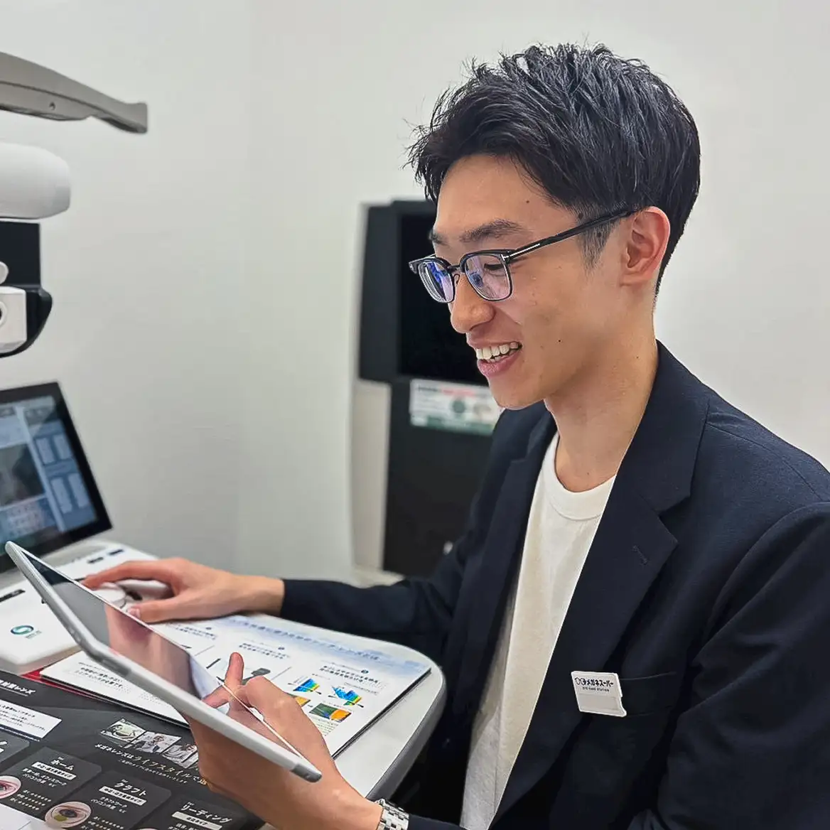 メガネは決して安い物ではありません。また、お客さまお一人おひとりの抱えるお悩みも多岐に渡ります。本当に悩んでいる方がたくさんいらっしゃるんです。だからこそ、まずは丁寧にカウンセリングを行い、生活の質がより良くなる為の解決策を様々な角度から提案することを心がけています。お客さまが「メガネスーパーに来てよかった」と思えるように、責任を持って向き合うことが私の接客の信念です。